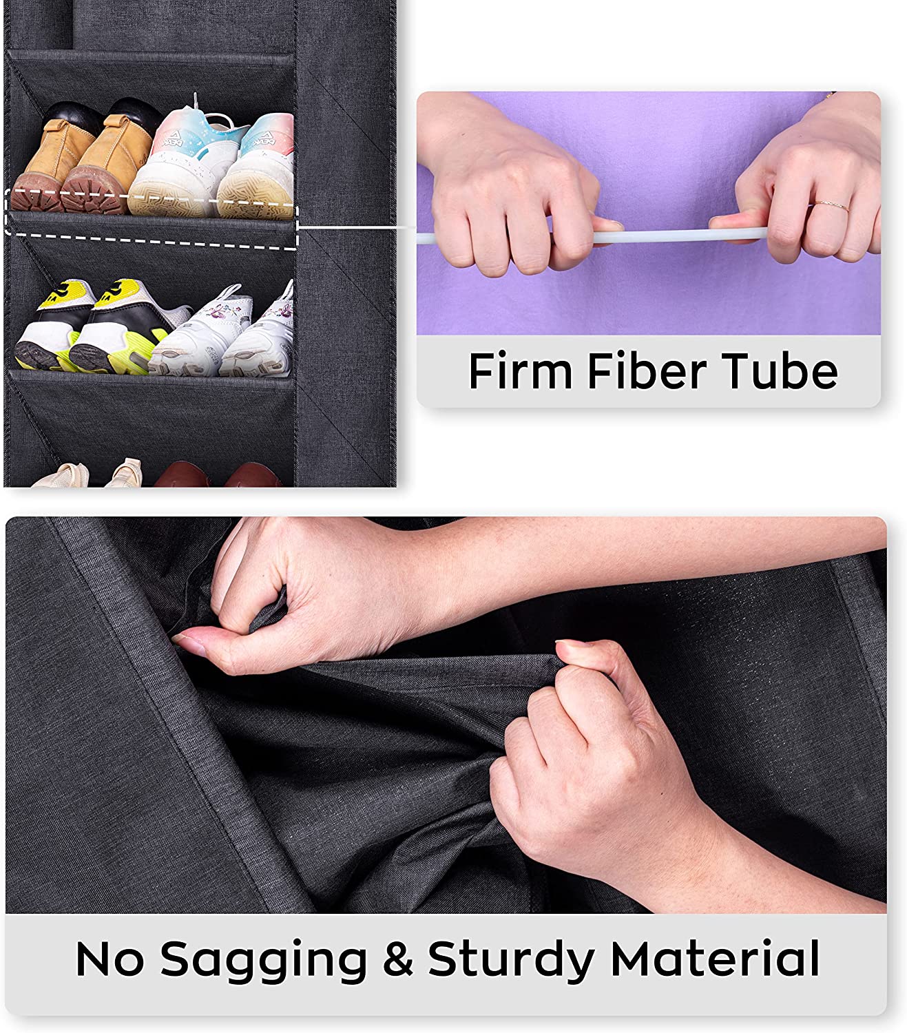 【Premium Oxford & Great Support】: The hanging shoe rack outside covered with premium quality oxford fabric, which have great tear resistance and with long life-span, adopted 5mm thick sturdy tubes to avoid deformation and squeezing to get strong bearing;