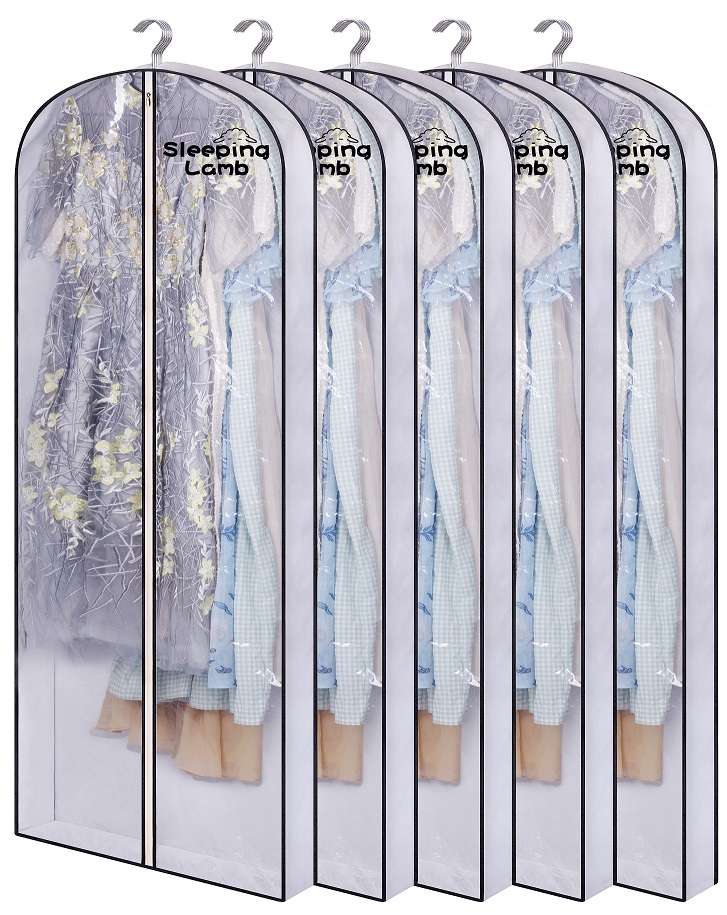 Don't use ordinary garment bags which take too much room and less storage space, If you want a great bag that will both protect your clothing and last for years, May as well try our coat protectors for closet, 4'' Gussets offered the more spacious capacity and help free-up you limited closet. Large Capacity: Garment bags with 4'' Gussets allow you to put in 8pcs long dresses easily without any squeezing only in one bag, holding 8 clothing need to use 4-5 ordinary garment bags at least. Size: 24''L * 4''W * 60''H. Package: Sets of 5 Dust-proof Design: Zippers are closed fully, well-made and sturdy, not like others that would break after zipping/unzipping once or twice. Easy to Access: Large clear front gives good visibility to what is exactly inside, without having to open each bag up.