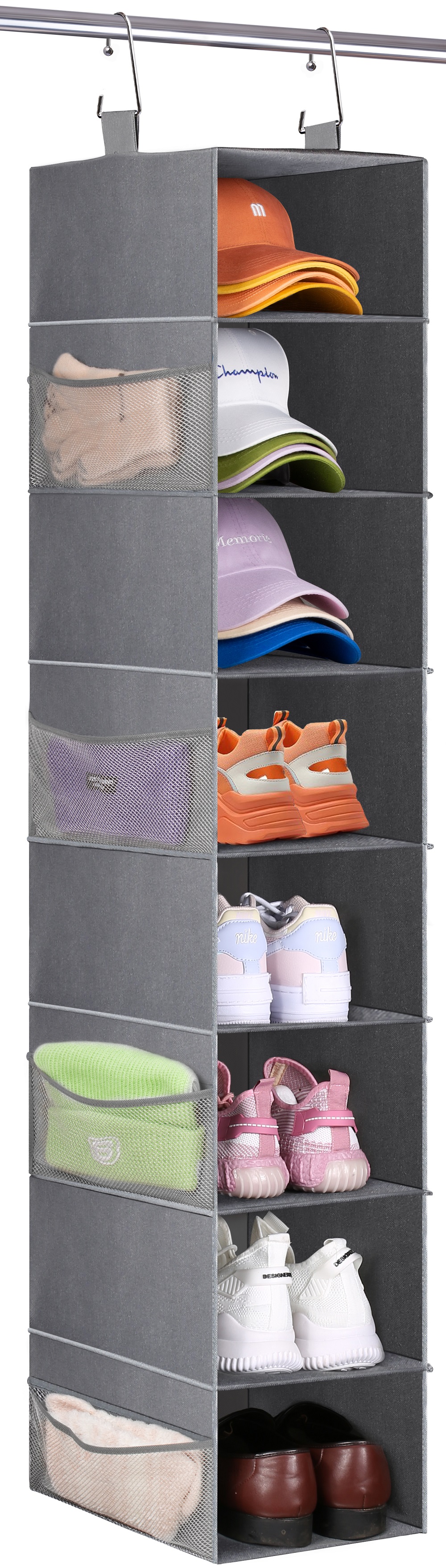 By consulting various hat collector, we are trying to offer a hanging shoe shelves that doesn't take up too much closet space and provides easy visibility/access to the hats, no longer sit them in a pile on top of the dresser. Large Capacity: Each of the 8 shelves is big enough to hold at least the 3-5 hats or 1 pair men shoes size 13, large than others, measured by: 6H*11.8D*9L. Strong Load-bearing: 2 sturdy and well made hooks provide safe storage, hang up nicely and in line so you can see them all before choosing which one you want to wear. Extra Storage: 8 side mesh pockets help more storage and free-up some space, makes your limited closet neat and organized. Versatile Organizer: Functional and does it's job, it is also a good way to store shoes, clothing, underwear, leggings, wigs, toys, bags, bras. Dimension: Slot Size: 11.8 D x 9 L x 6 H Overall Size: 11.8 D x 9 L x 48.5 H.